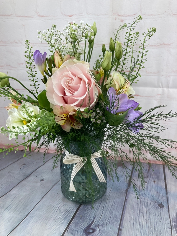 Textured vase filled with a pretty selection of seasonal flowers.
